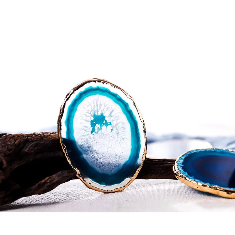 Protect your surfaces in style with our blue agate slice coasters. Their smooth, polished surface not only prevents water rings but also brings a sophisticated touch of nature-inspired design to your coffee table or dining area.